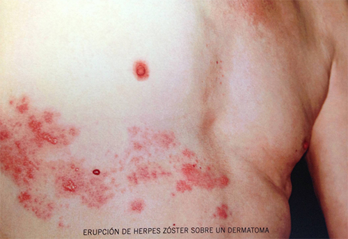 El nombre Zóster indica que se presenta por zonas, las más frecuentes son torax (siguiendo los trayectos de las costillas) o en cara llegándose a afectar el ojo.
